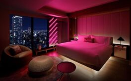 Japan’s first W hotel retains the hospitality brand’s funky aesthetic but also has an authentically Japanese feeling of harmony, starting with a reflective black monolith facade by renowned architect and son of Osaka, Tadao Ando. This minimalist exterior leads to bold, design-led interiors that expertly mix creature comforts and urban vibes, such as an origami-inspired arrival area, neon-lit rooms and a sleek infinity pool that swims up to a bar.